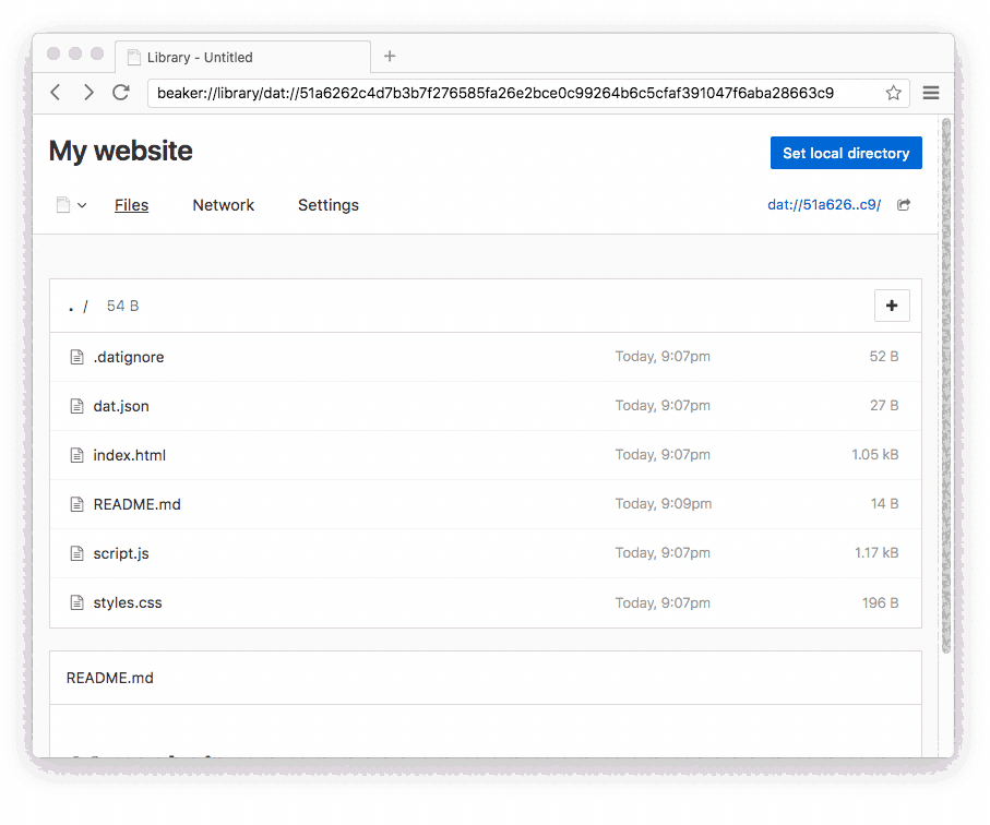 发布到Dat对等网站的每个更改都将添加到其历史记录日志中,并通过网络进行分发。使用烧杯,您可以使用内置版本的URL访问其历史记录中的任何一个网站dat://beakerbrowser.com+42。