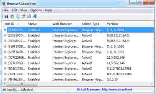 browseraddonsview运行后,主窗口显示所有列表插件在你的系统发现。你可以选择一个或更多的插件项目,和出口到CSV的插件列表/