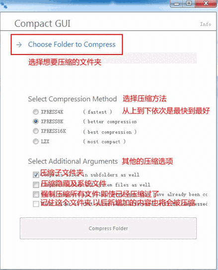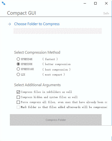 CompactGUI是一款专业的压缩工具软件。软件可以帮助使用者以正常文件夹浏览、选择、快速压缩需要的文件,使用方法也很简单,先选择需要压缩的文件,在四个压缩方法中选择一个,勾选需要的压缩选项后点击压缩即可。使用起来十分的方便快捷,是一款很实用的工具。