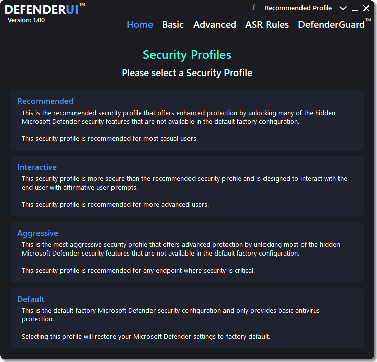 DefenderUI是一款非常实用的图形设置软件,软件界面简洁,操作简单易用,提升了Microsoft Defender 的可用性,解锁了 Microsoft Defender 隐藏的安全功能,还提供了推荐、互动式、攻击性、默认模式 4 种模式,对应 4 种不同的配置,用户可以随时切换,有需要的小伙伴赶快来下载体验吧!