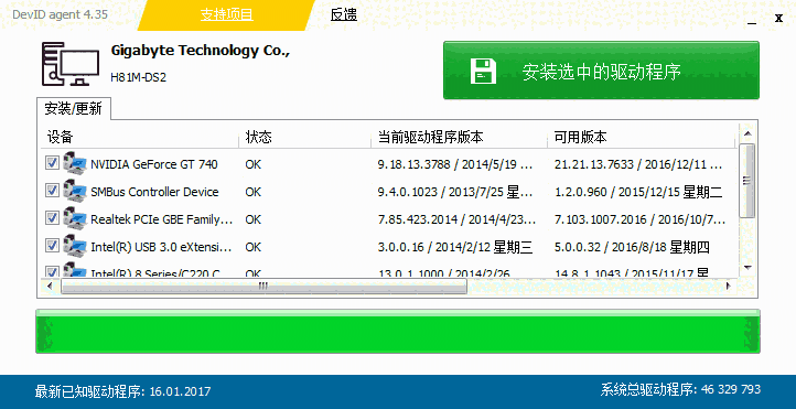 要开始搜索请点击“搜索新驱动程序”按钮,搜索结束后将会显示需要安装和升级的驱动程序。您需要勾选您想安装或升级的驱动程序。然后点击安装选中的驱动程序按钮。