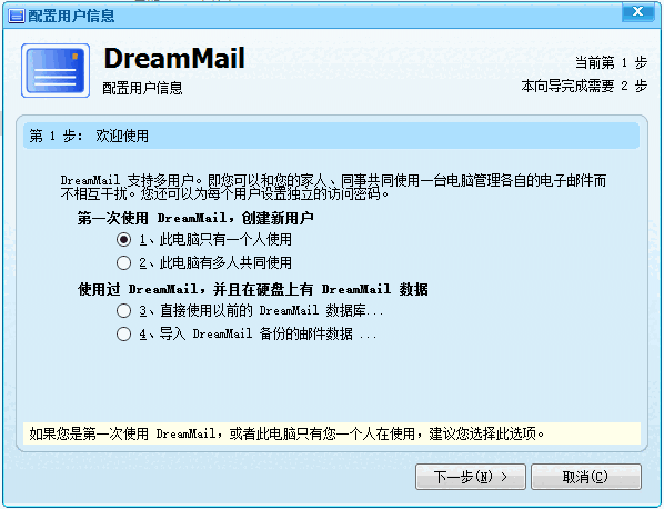 1、点击应用程序,第一次使用DreamMail,需要创建新用户,如果此电脑只要一份人使用则选择1,如果多人使用选择2,然后点击下一步