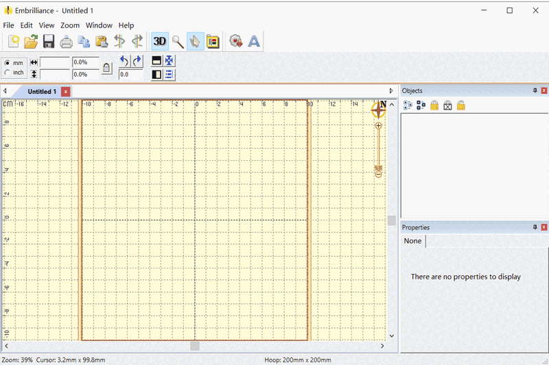 主视图显示当前的设计页面。设计页面是.BE文件的表示,它可以包含多个刺绣设计,刻字对象和框架。