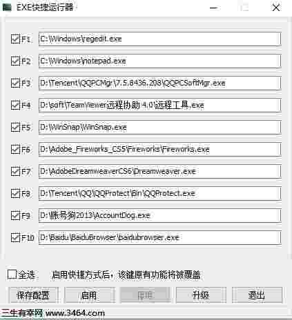 exe快捷运行器是一款专业的应用程序快捷启动的工具软件。使用者可以通过软件将F1-F10这10个键位单独设置某个应用程序的快捷启动键,在使用者需要时,按下某个键位就可以直接启动打开预设的应用程序,十分方便快捷。