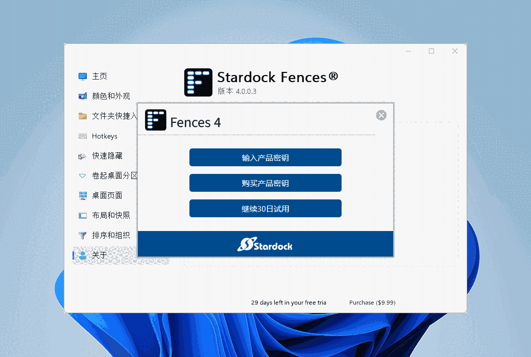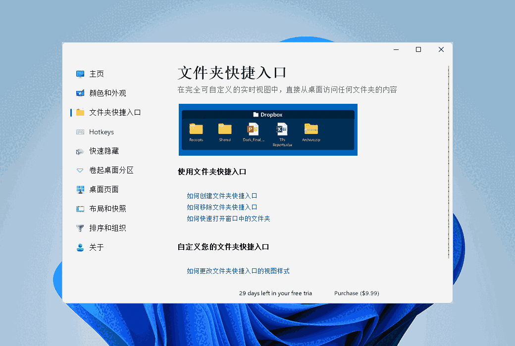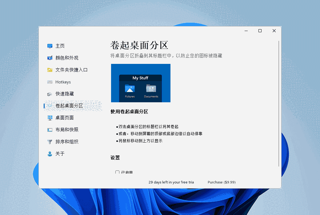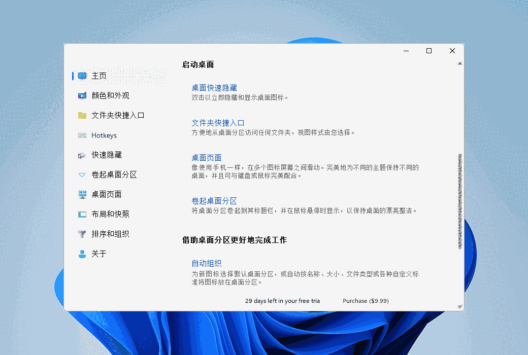 通过将桌面内容智能地放置在称为围栏的阴影区域中来整理电脑桌面图标。