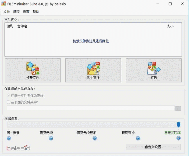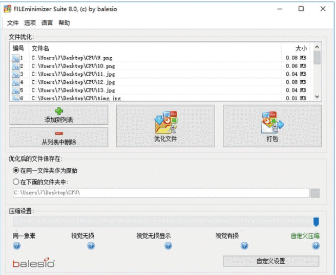 Word、PowerPoint、Excel、JPG、BMP、PNG、GIFF、TIFF等格式。文件的压缩过程非常简单,用户只需选择需要压缩的文件并选择压缩比率就可以了,无论是低档,标准还是高级都可以轻而易举办到,只需点击优化按钮,就是如此简单。