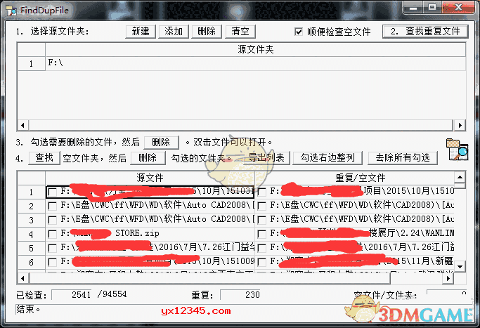 1、可以搜索指定目录及其下子目录,列出所有内容完全相同的文件(文件名可能不同),随后需要您选择是否删除重复的文件