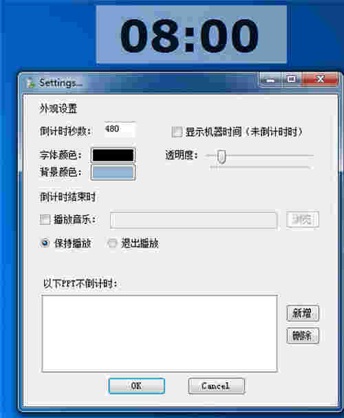 在悬浮窗上点右键,设置,可以调整倒计时时间(秒)、透明度、显示机器时间、颜色、倒计时播放音乐、不计时PPT。