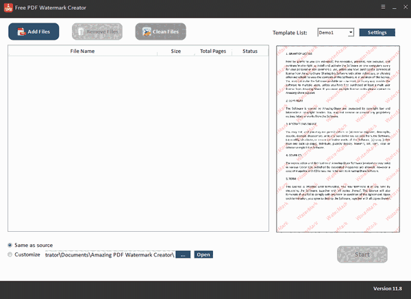 Creator软件支持批量添加PDF水印。单击“添加文件”按钮以导入PDF文档文件。您可以选择文件,然后单击“删除文件”按钮以删除界面上不需要的PDF文档,或单击“清理文件”以删除所有导入的PDF文件。单击“设置”以自定义文本或图像。