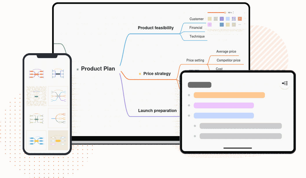 内置思维导图、流程图、UML图等各种模板主题供用户选择,从产品设计到知识梳理再到读书笔记,各种模板都有,质量相当不错。点击任意模板进入详情页面,预览模板详情,点击右上角使用模板,直接基于该模板创建思维导图或流程图。之后,用户可以随意修改和定制基于模板创建的新思维导图。