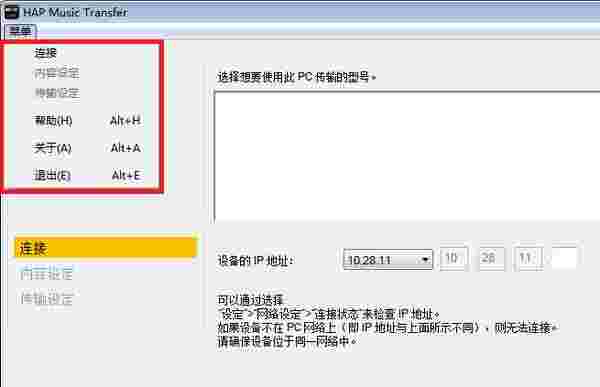 Transfer的软件版本。通过“连接”、“内容设定”或“传输设定”窗口可以选择系统菜单。