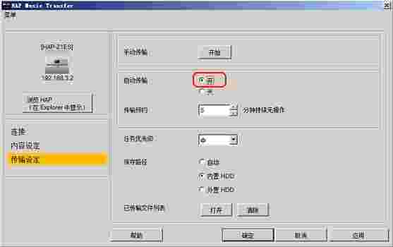 如果设置了自动传输功能,当计算机的指定文件夹中增加了新的音乐文件时,它就会自动将这些音乐文件传输至硬盘音频播放器。