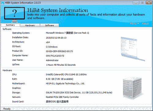 HiBit System Information是一款专业的电脑硬件信息检测的软件工具,用户安装该软件后,可以使用软件对自己的电脑硬件进行检测,可以查看硬件的详细信息,也可以监控后台软件的运行进程。软件可以存储在便携的存储设备上,方便你走到哪用到哪。
