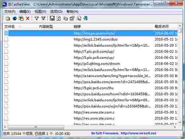 IECacheView显示更多在Windows上并没有显示的栏目: 内容类型, 点击次数, 子文件夹名称包含完整路径的缓存文件名。