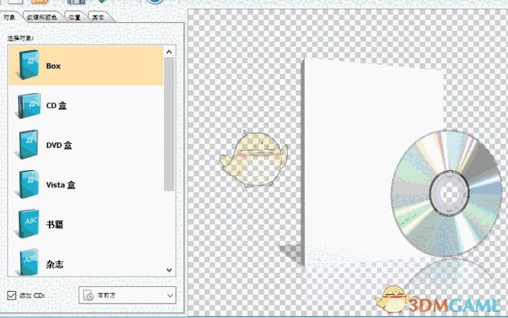 该添加CD复选框光盘添加到项目中。复选框右侧的下拉列表允许以确定光盘的相对于物件的位置,左前方,右前方,左后方,右后方。您也可以指定自定义光盘的纹理(见纹理和颜色标签)。
