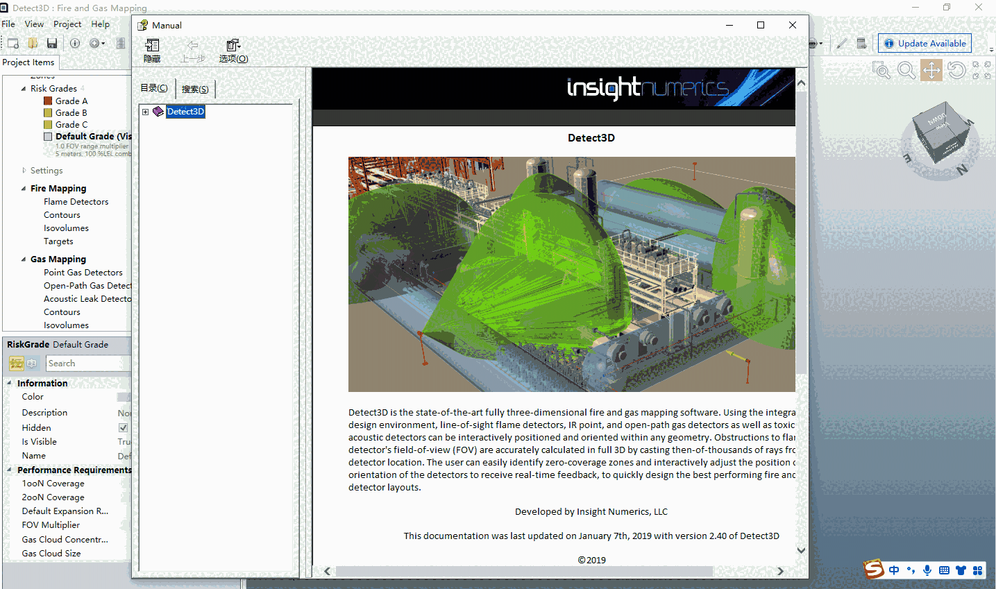 Insight Numerics Detect3D是一款专业的火灾映射分析的工具软件。使用者可以通过软件来分析假设火灾发生后的火焰映射、气体映射。软件集成了cad文件,可以将dwg图纸文件直接导入软件进行查看。整体来说是一款不错的软件工具。