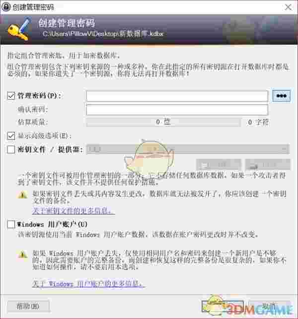 密钥文件是一个密码校验文件,如果选择了密钥文件,则以后打开数据库除了密码还需要这个密钥文件才能打开,可以选择以提高安全性。密钥文件可以是一个文本,一张图片,一个表情包或者一个key文件等等等等。你甚至可以用你的身份证扫描件或者你喜欢的大姐姐视频做密钥文件。