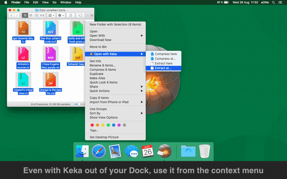 使用时甚至不需要打开Keka,只需将Keka放入Dock即可。
