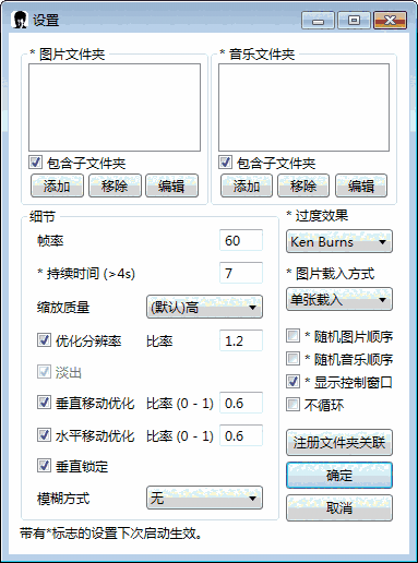 首次使用需要设置图片文件夹和音乐文件夹(可选)。