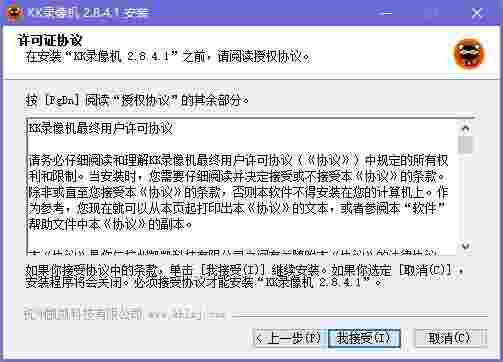 2、阅读KK录像机授权协议,点击“我接受”即可。
