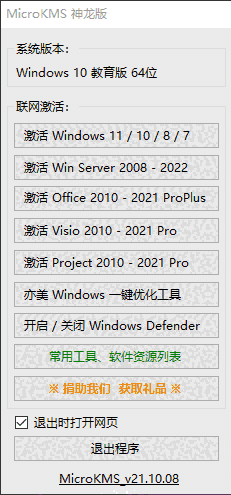 KMS激活工具正式版是一款非常实用的激活软件,软件操作非常方便,有效地帮助你成功激活Windows 11、Windows 10、Windows 8.1、Windows 8、Windows 7等系统,其中包括专业版、企业版、教育版、家庭版等等,能够满足大多数场景下的系统激活需求,有需求的小伙伴千万不要错过!
