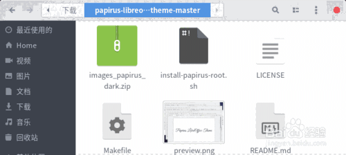 6、你可以将下载的压缩包进行解压出来,然后运行附带的Shell脚本(就是.sh文件)。接下来就需要你将相应图标主题安装到指定的位置,再按照以上方法进行图标样式切换。
