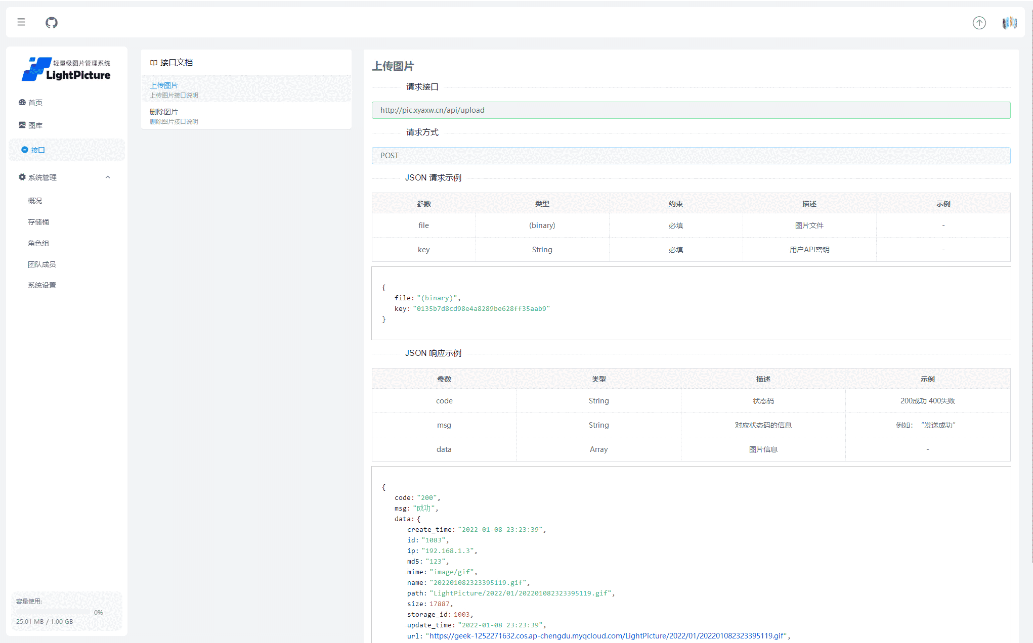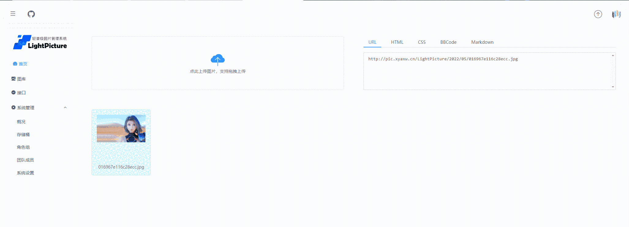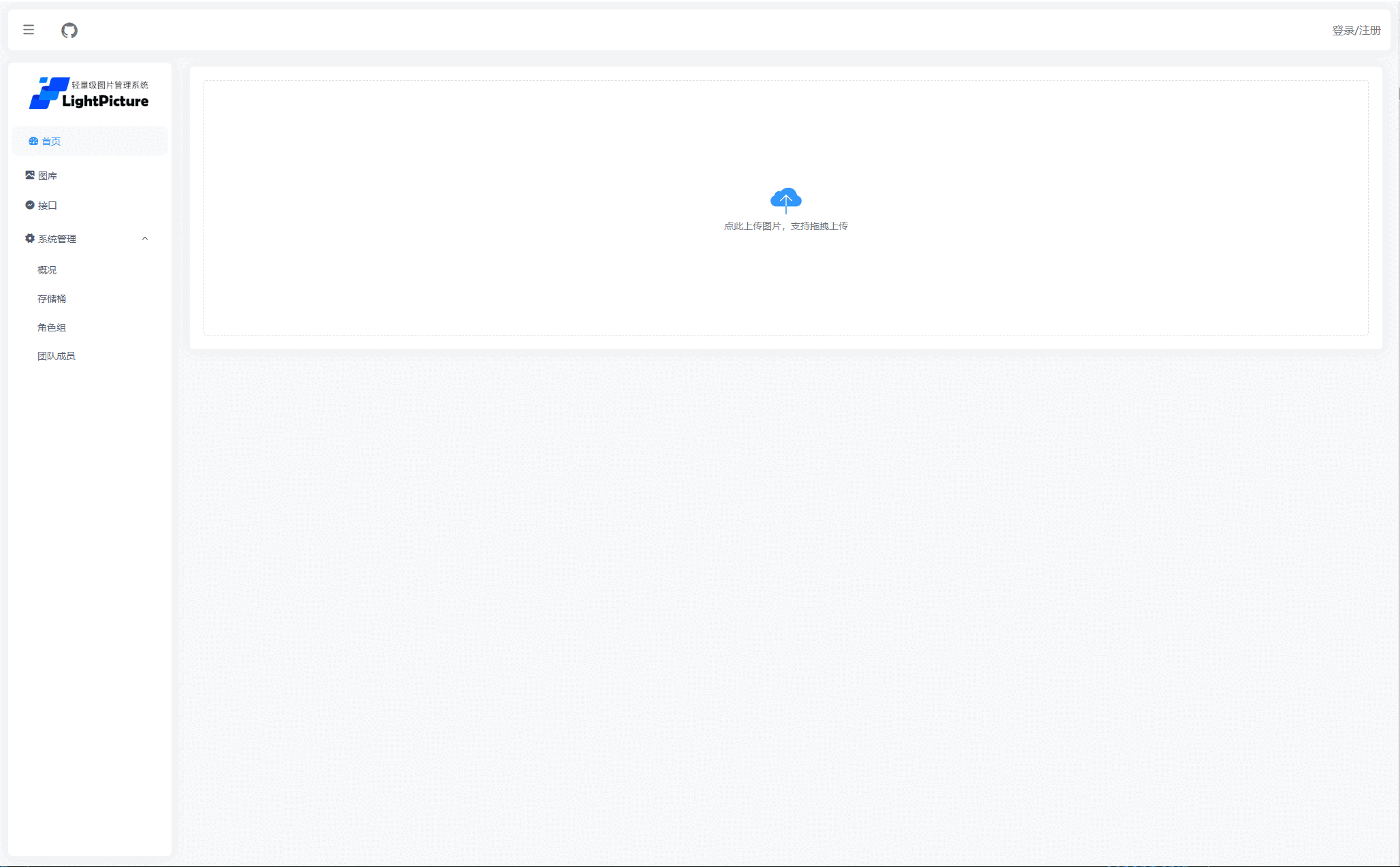 LightPicture – 开源图床系统 高性能、精致、扁平化、多样化储存式的企业化免费图床程序,LightPicture图床系统支持第三方云储存,本地、阿里云 OSS、腾讯云 COS、七牛云 支持多桶储存,可同时添加多个对象存储桶管理 多图上传、拖拽上传、粘贴上传、上传预览、全屏预览、一键复制图片外链 多用户管理、分组管理;不同分组用户控制不同的存储桶 完整的权限控制功能,不同用户组可分配不同的操作权限,控制其上传删除及查看 完整的可视化日志功能,记录用户所有操作,方便事件溯源 全局配置用户初始剩余储存空间、设置指定用户剩余储存空间 支持接口上传、接口删除 原创Geek扁平化页面风格,简约大气;前端使用vue开发,前后端分离