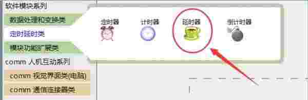 我们已经把指示灯模块拖进来并连接好,那么要做一个每秒钟闪烁一次的闪烁灯,我们还需要时间相关的模块。这个时间模块就是延时器,它在软件模块系列里边的定时延时类。鼠标左键点击可以添加到编程界面中