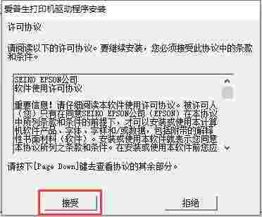 2、进入爱普生 LQ-630K 打印机驱动程序安装协议界面,点击【接受】。