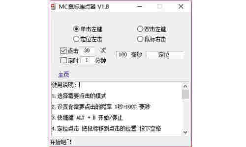 MC鼠标连点器是一款体积非常小并且能让用户朋友进行鼠标连点的小工具,如果你遇到了一个需要鼠标狂点的场面,使用这款MC鼠标连点器进行简单的设置后一秒钟帮你点100下都不是什么难题,软件支持四种连接方式,包括单击和双击左键,定位左键和鼠标右键。非常方便快捷,简单的软件界面,直观清晰的布局。操作简单,使用方便,是一款非常实用的工具,喜欢的快来下载使用吧!