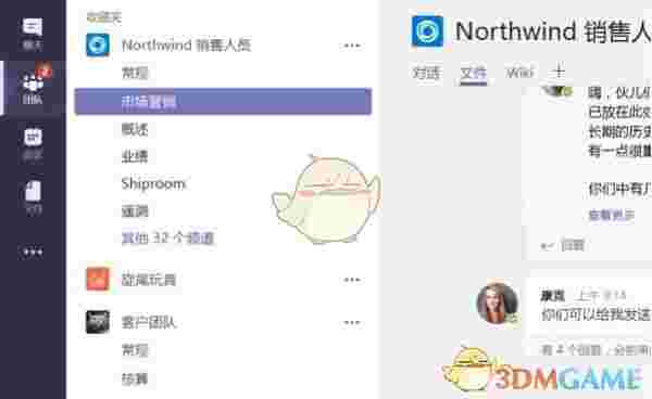 在主界面的侧边栏我们可以看见很多的选项,有活动,聊天,团队,文件还有更多应用选项,功能很齐全。