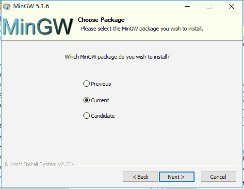 4、选择一个MinGW包安装,previous(以前)、current(现在)、candidate(候选),您可以自行选择,选择完成后点击【Next】。