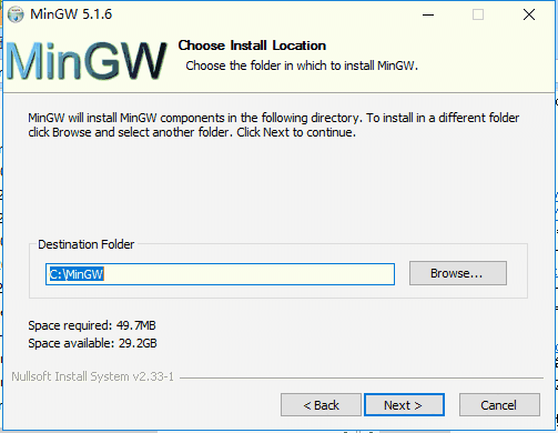 6、选择MinGW安装位置,您可以点击【next】,软件会自动安装。或者您可以点击【Browse】,在弹出的安装位置界面中,您可以自行选择MinGW安装位置,选择完成后,点击【next】。