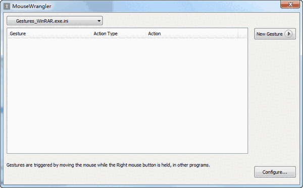 软件提供了模糊匹配、拖动的长度等选项,让鼠标手势的使用更加灵活。可以为不同的应用程序使用独立的ini配置文件来保存你设置的鼠标手势,如果将手势保存到gestures.ini中,则为全局使用。相比较同类软件,MouseWrangler支持更复杂的动作。