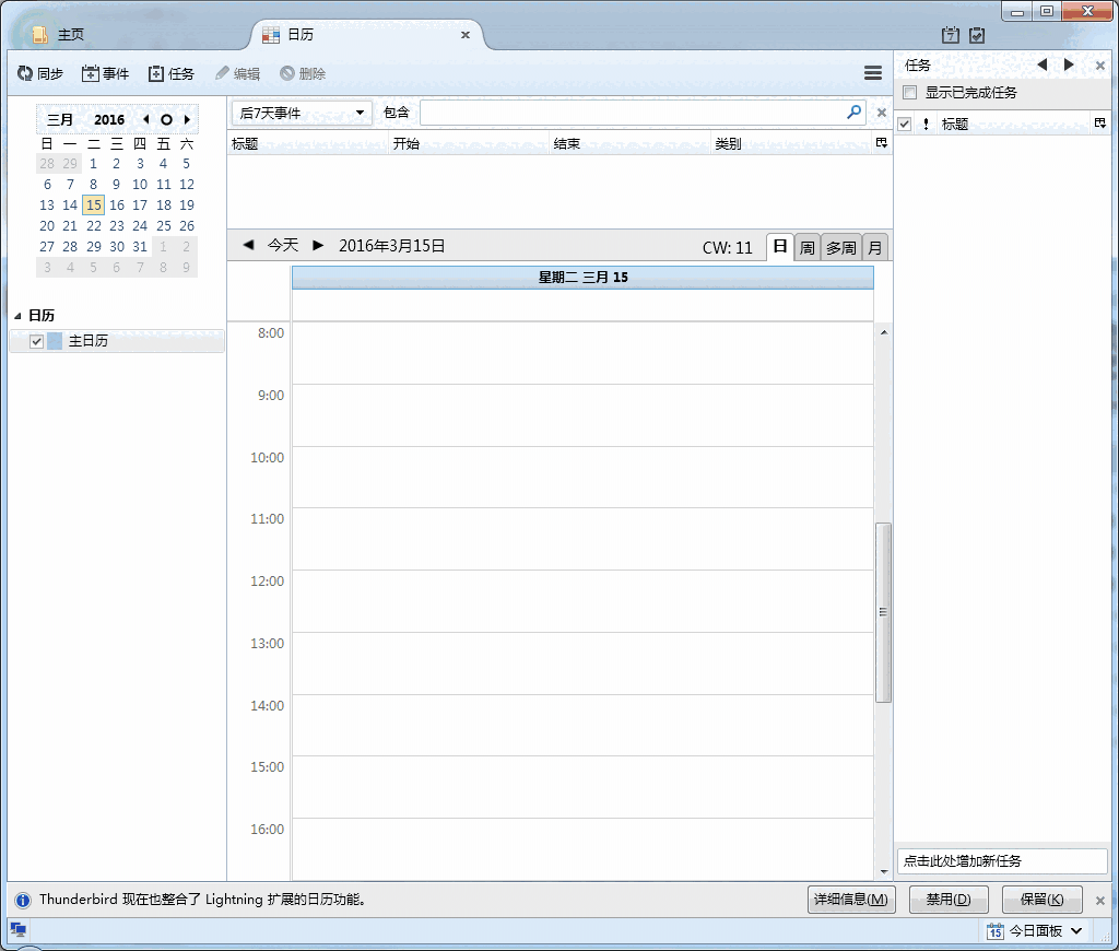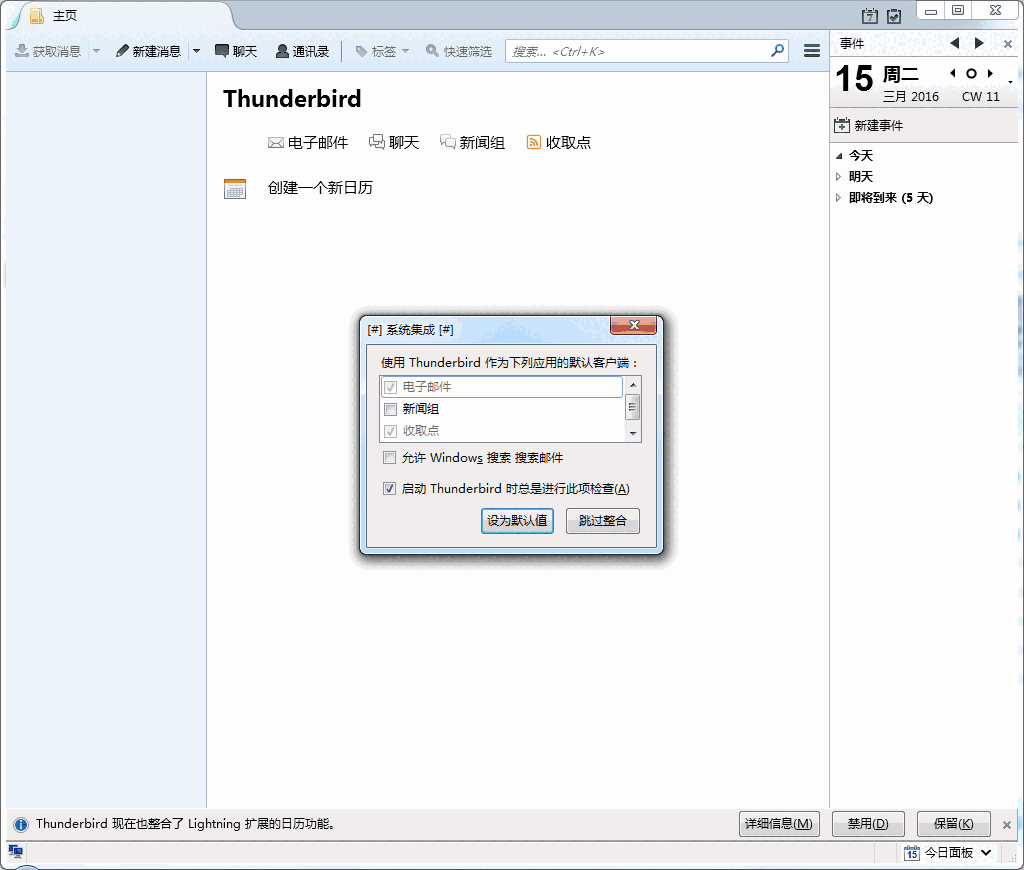 Thunderbird默认只支持新闻组和电子邮件客户端(问题已经得到了解决。通过安装Lightening扩展,Thunderbird即可成为日程管理软件)。