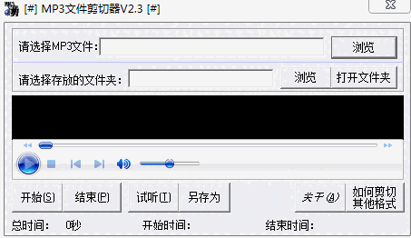 首先选择您需要剪切的MP3文件,然后选择存放剪切之后的MP3的文件夹,点击开始和结束。三步轻松获得您想要的MP3片段。
