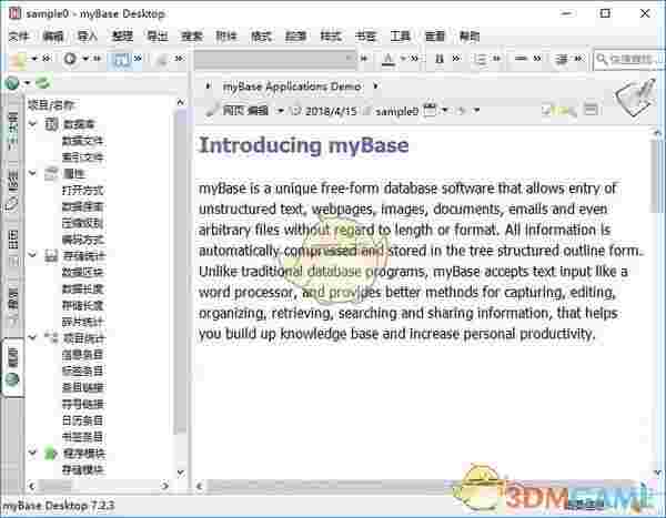 myBase Desktop 是一款用于分类存储管理任意格式资料的小型个人数据库软件, 有助于个人用户在(Linux/MacOSX/Windows)桌面电脑系统上实施文档、知识、笔记、日记、图片和网页的分类存储和管理。 借助软件提供的各项功能,创建和维护一个专属于自己的个人知识库将变的相对简单快捷。