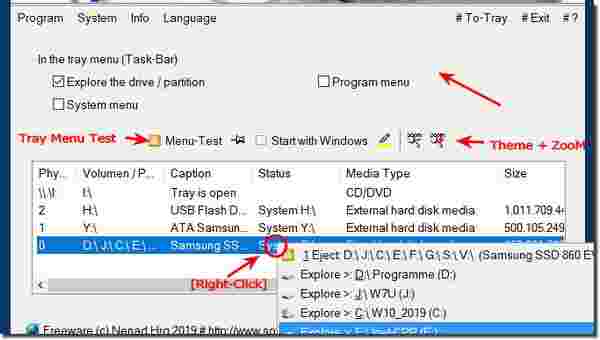 启动该程序。第一次为您提供安全删除USB,SD,…驱动器的默认设置。例如,通过任务栏的“信息”区域直接打开驱动器(Explorer)以打开,关闭和弹出驱动器。但你可以快速定制一切!