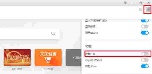 运行浏览器,点击【快速设置】按钮,在【功能】下,点击【拦截广告】