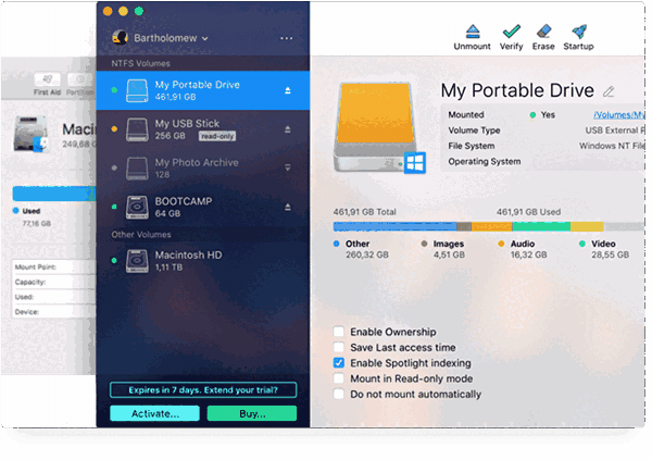 Mac继承了苹果最好的磁盘工具,并将其升级到一个新的水平,增加了NTFS卷操作和高级安装选项。只需将硬盘或其他外部存储设备连接到Mac,即可访问NTFS文件。