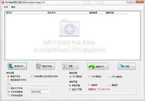 运行程序,添加您的PDF文件到文件列表里,选择一个旋转方向(90度顺时针,90度逆时针,180度),点击“开始旋转PDF文件”按钮即可。