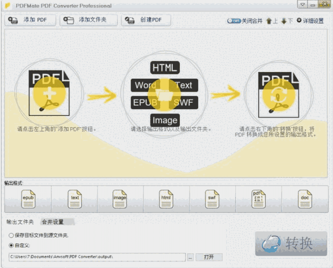 PDFMate PDF Converter Pro是一款专业的PDF文件的格式转换工具软件。使用者可以通过软件将PDF文件转换为不同的文件格式包括doc、jpg、png、epub、mobi等等。软件的使用方法也很简单,选择要转换的pdf文件、转换的格式,设定好转换参数和输出路径,点击转换即可。