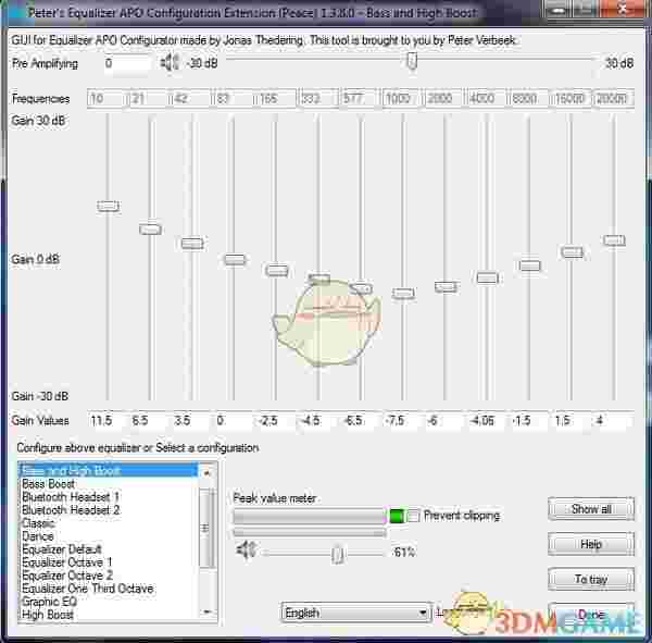 通过运行下载的PeaceSetup.exe进行安装。必须先安装Equalizer APO。Windows更新后,可能需要重新安装Equalizer APO。