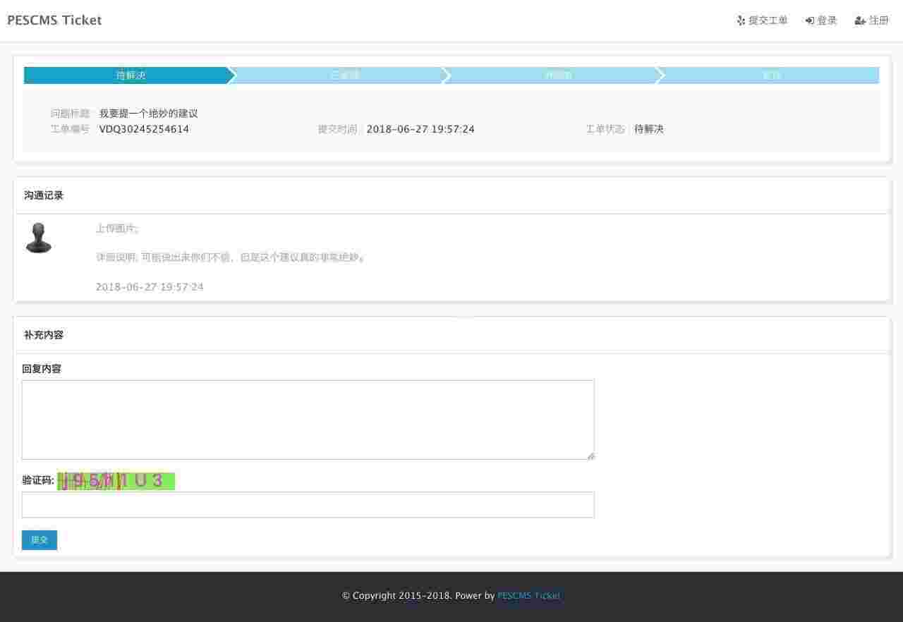 PESCMS Ticket客服工单系统(下称PT)是一款基于GPLv2协议发布的开源客服工单系统。除了传统的站内工单提交模式,我们以全新的设计理念,基于Javascript语言开发的跨域工单提交。实现在任何系统、任何页面,只需要调用一句Javascript代码,即可生成工单系统!