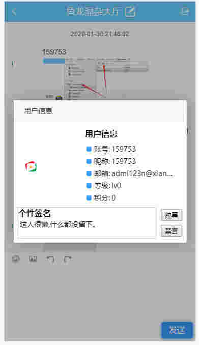 程序前台与后台自适应PC与移动端,支持一对多交流,可以自由创建新的房间与解散创建的房间,集成签到功能,等级功能,房间创建者可以对用户进行禁言、拉黑处理,房间可以由房间创建者自由设置进入密码,房间内支持 常规的文字消息、表情、支持自定义图片消息、图片可用本地或者图片外链。