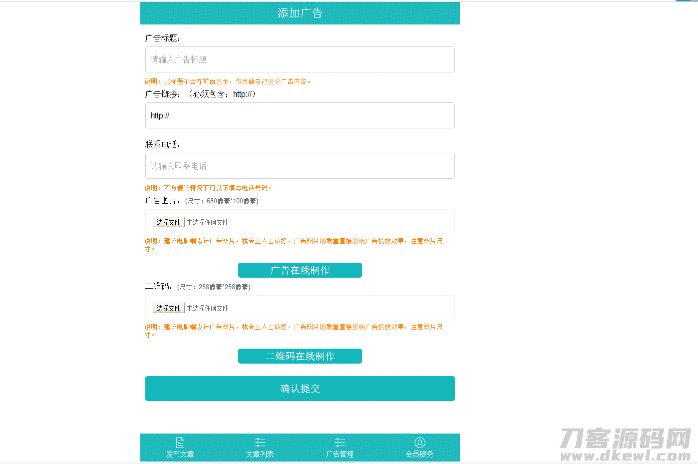 用户自己可以新增广告,暂时仅有顶部及底部两个广告位。