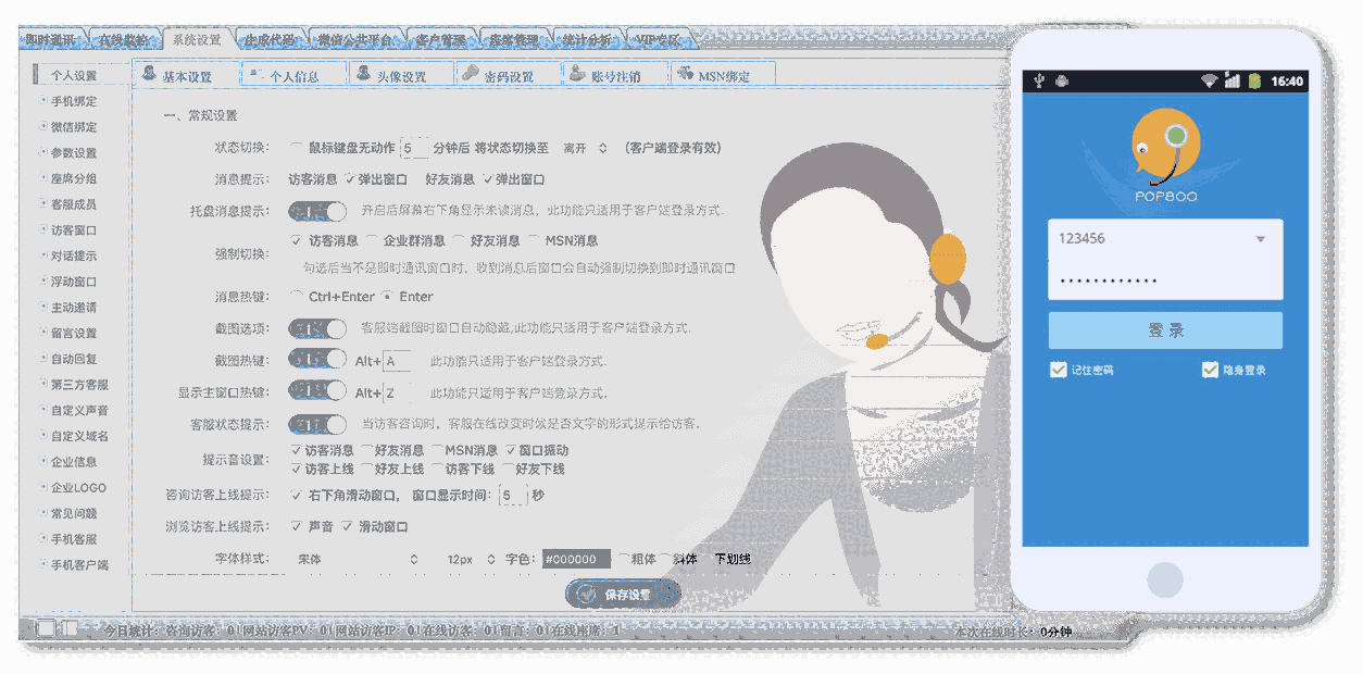 POP800在线客服系统是一款专业的客服通讯的软件工具,软件支持多个平台登录、实时监控网站动态、营销分析、多站点管理、防骚扰。非常方便快捷,软件界面简约,布局直观清晰。操作简单,容易上手,是一款十分实用的工具。