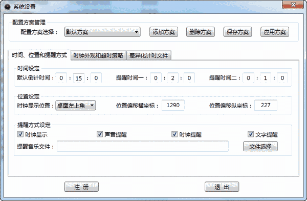 提醒:声音提醒、背景闪烁、文本提醒3种提醒任选。可以根据需要设置两个提醒时间。
