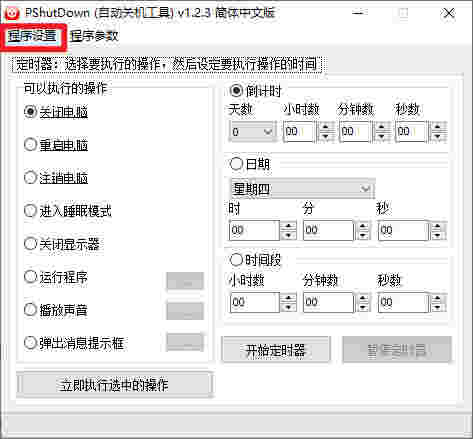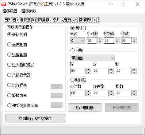PShutDown是一款小巧实用的开关机工具,具备多种定时模式,包括倒计时关机、指定时间关机、循环执行等,支持关机前显示提示消息,帮助用户保存工作,同时可设置开机后自动运行指定程序,适合个人用户管理电脑使用时间,软件资源占用低,运行稳定可靠,喜欢的小伙伴千万别错过,快来下载吧!