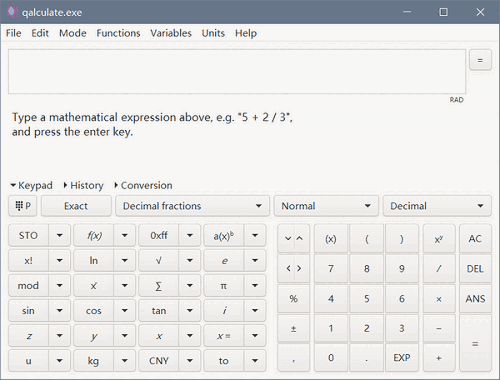 qalculate是一款专业的桌面计算器工具软件。软件可以帮助使用者计算各种各样的公式。支持计算函数、单位、变量、向量、矩阵、微分与积分等等。软件的界面的布局非常简洁,功能完善,使用方法也非常简单,因此使用过程也很方便。